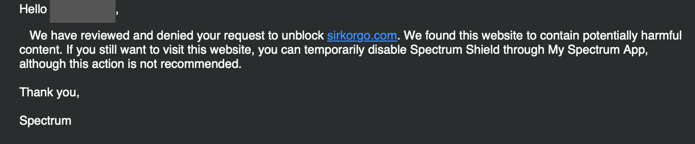 I went ahead and submit an appeal to get the site unblocked, and within a day I got a reply. āWe have reviewed and denied your request to unblock sirkorgo.com. We found this website to contain potentially harmful content.ā